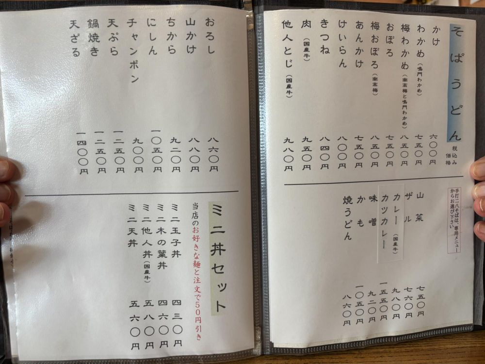 そばうどんメニューがありますが、こちらの「そば」は、手打ちの二八ではなく、一般的なお店で見られる普通の機械打ちのそばです。