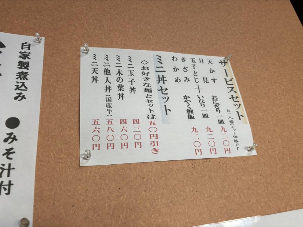 サービスセットやミニ丼セットです。手打ちそばにアクセントとして丼をつけられるわけですね。