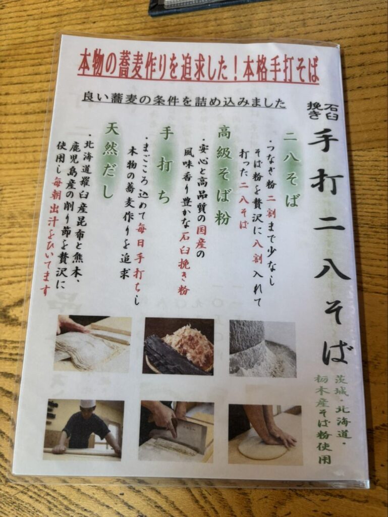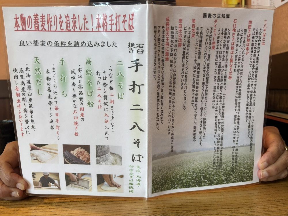 手打ちの二八そばをいただこうとすると、専用のメニューがありました。こだわりの二八そばとはどういうものか、そば粉へのこだわりや毎日そばを打っていること。