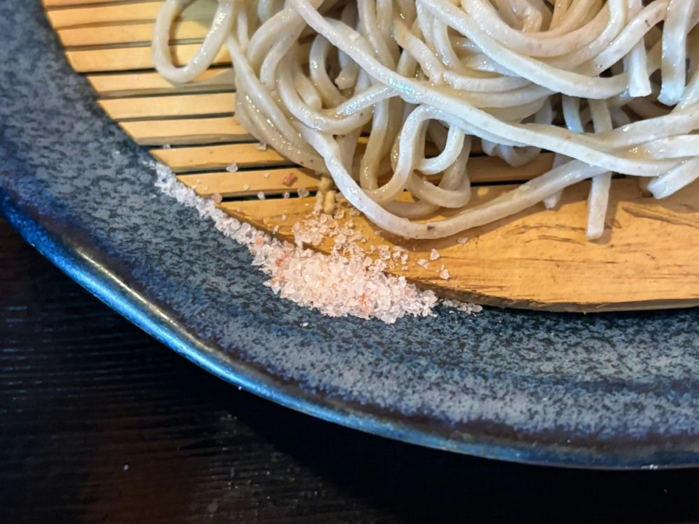 「そばを岩塩だけで食べてみてください」とお店の人。岩塩をそばの横に置いてくださいました。塩だけで食べてくれということは、それだけ「そば」そのものに自信がないと言えないこと。