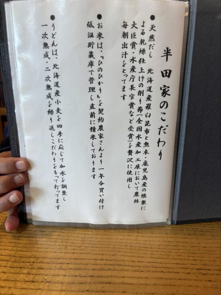 あらためて半田家さんのこだわりを紹介しています。壁にこういうのを貼っているということは、味に自信があるからできること。それだけ美味しいという証なのかなと思いました。