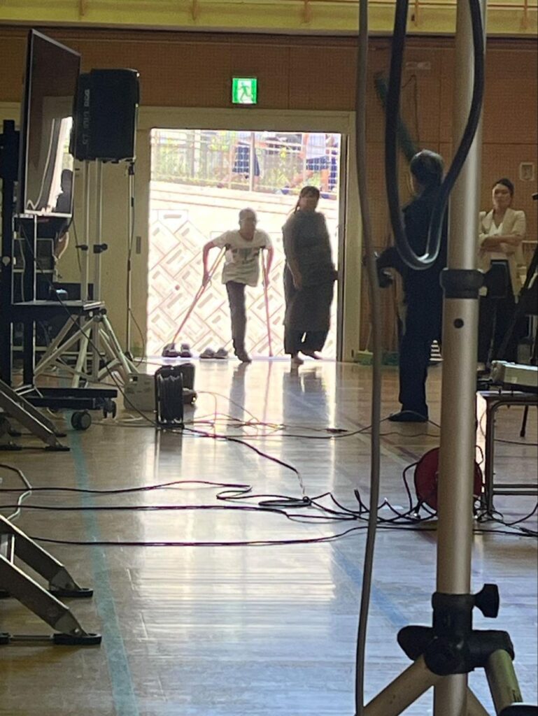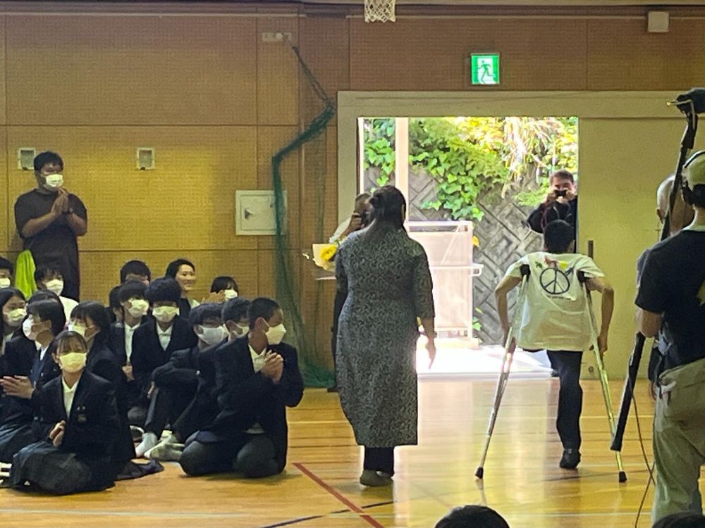 特別授業で体育館に入ってくるドクさんと通訳の方の右側をみると、映画スタッフが映っています。このときがこの日もっとも大事な撮影のタイミングだったようで、いちばん右に写っているルースさんも真剣な表情で撮影を見守っていることがわかります。