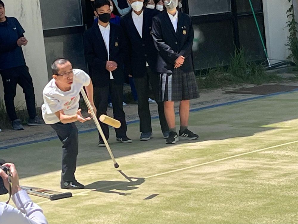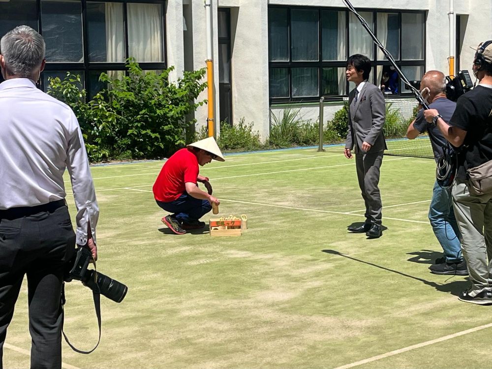 そして、ドクさんが中学生とモルックを楽しむのですが、右側を見ると撮影クルーの姿が見えます。ちなみに左に写っている方は大手新聞社のカメラマンさんです。