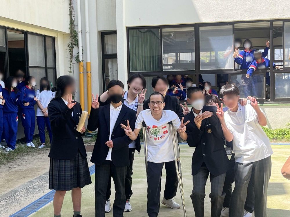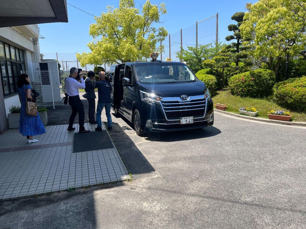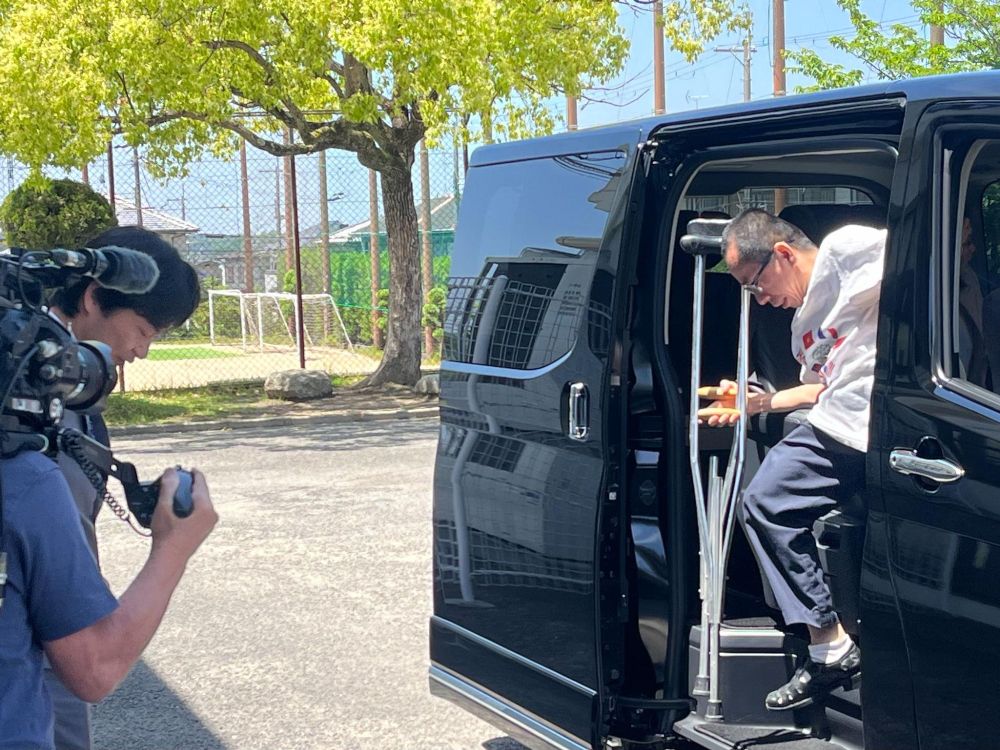 ドクさんが送迎タクシーから出てくるシーンです。左に内本校長が映っていますが、その左に機材を持った映画のクルーがいるのがわかりますね。実は東京からルースさんを始めとする映画クルーが、ドクさんの撮影のために東中学校に来ていました。