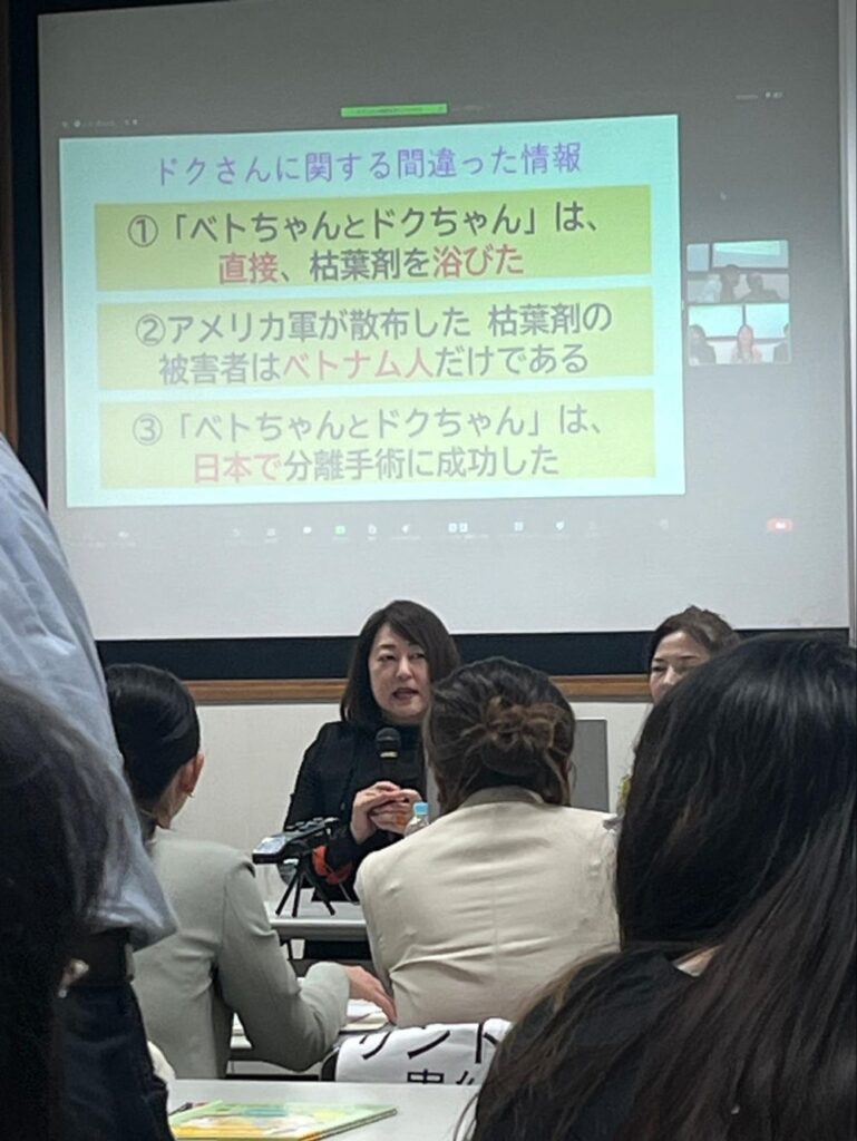 内本校長は10年ほど前の映像作品を紹介していました。ドクさんや支援者らと枯葉剤の影響が指摘され、先天性の障害を持つ子どもたちの慰問の様子です。