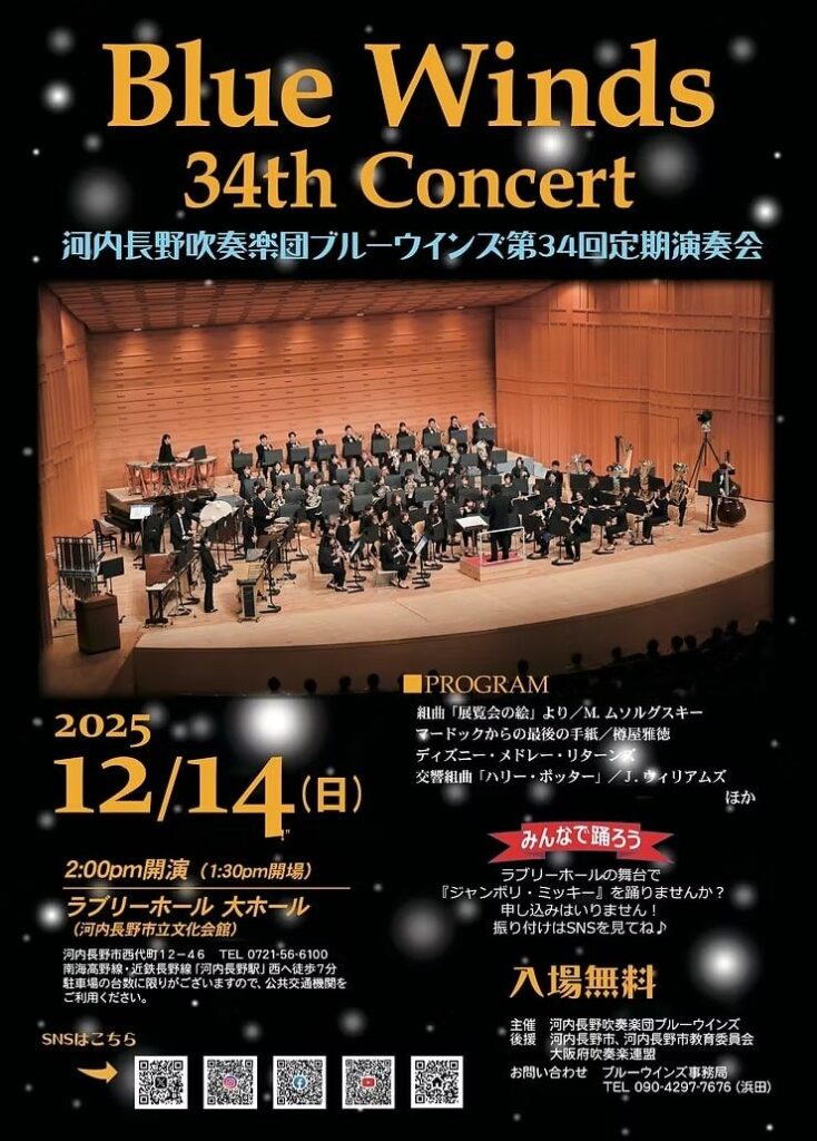 12月14日日曜日に河内長野吹奏楽団「ブルーウィンズ」が、34回目の定期演奏会を開催します。14:00開演で13:30開場 場所はラブリーホール大ホールです。