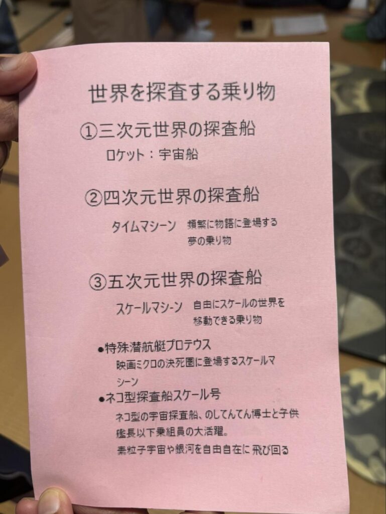 各次元を探査する船の紹介です。①の三次元はロケット・宇宙船で探査するもので、現実的に知っているものです。②の四次元はタイムマシーン、これは漫画・アニメや映画などの物語の世界で登場しているので名前だけは多くの人に知られています。