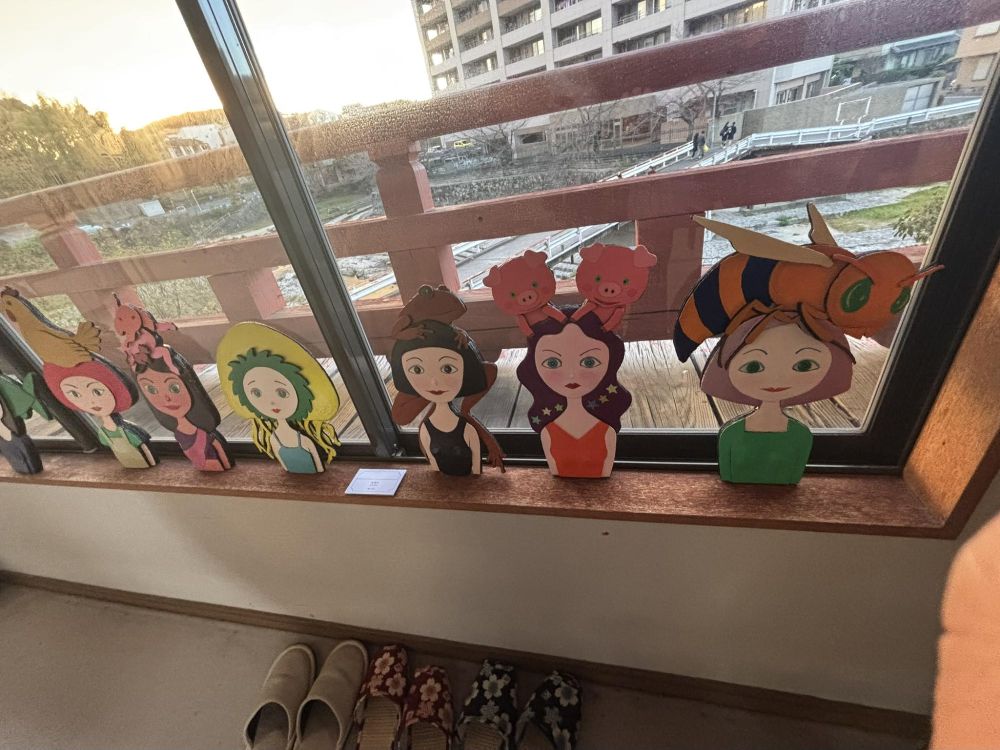 ただ可愛いだけではありません。張り子の虎のように頭が動きます。森さんによれば「朝の散歩で出会った人たちの立ち話」をコンセプトに作られた作品です。実は段ボールでできているそうで、段ボールに和紙を張り付けて色を付けて作ったとのこと。