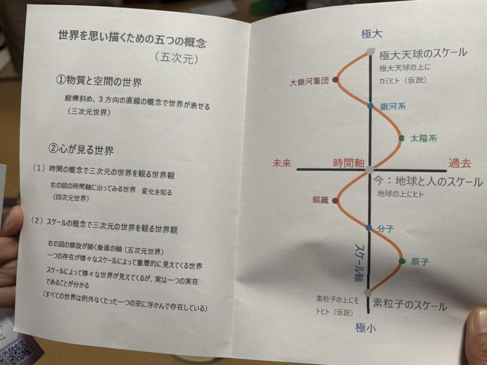 作品を創作した北薮 和(Kitayabu Waa)さんは、世界を思い描くための5つの概念を表しているとのこと。三次元までは普通に見える物質と空間の世界で、これに心が見る世界を四次元と表し、さらにスケールの疑念を取り込んで右の図を表すのが五次元世界とのこと。
