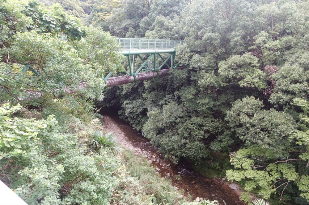 画像は汐滝橋の少し上流にある橋で旭ヶ丘に続いています。その周りの崖のようなところが石川西岸(画像右側)です。この画像の緑に覆われたところに細い道があって、高向と日野を結んでいたということらしいのですが、確かに「ここを歩け」と言われるとちょっと躊躇しますし、一歩間違えたら川に転落しそうです。