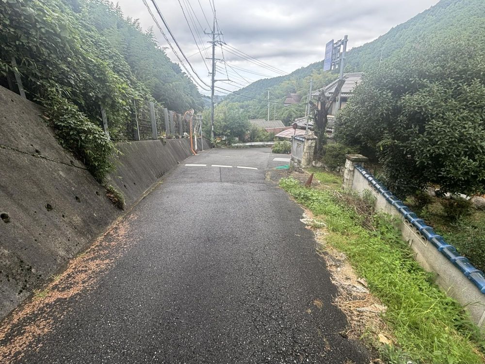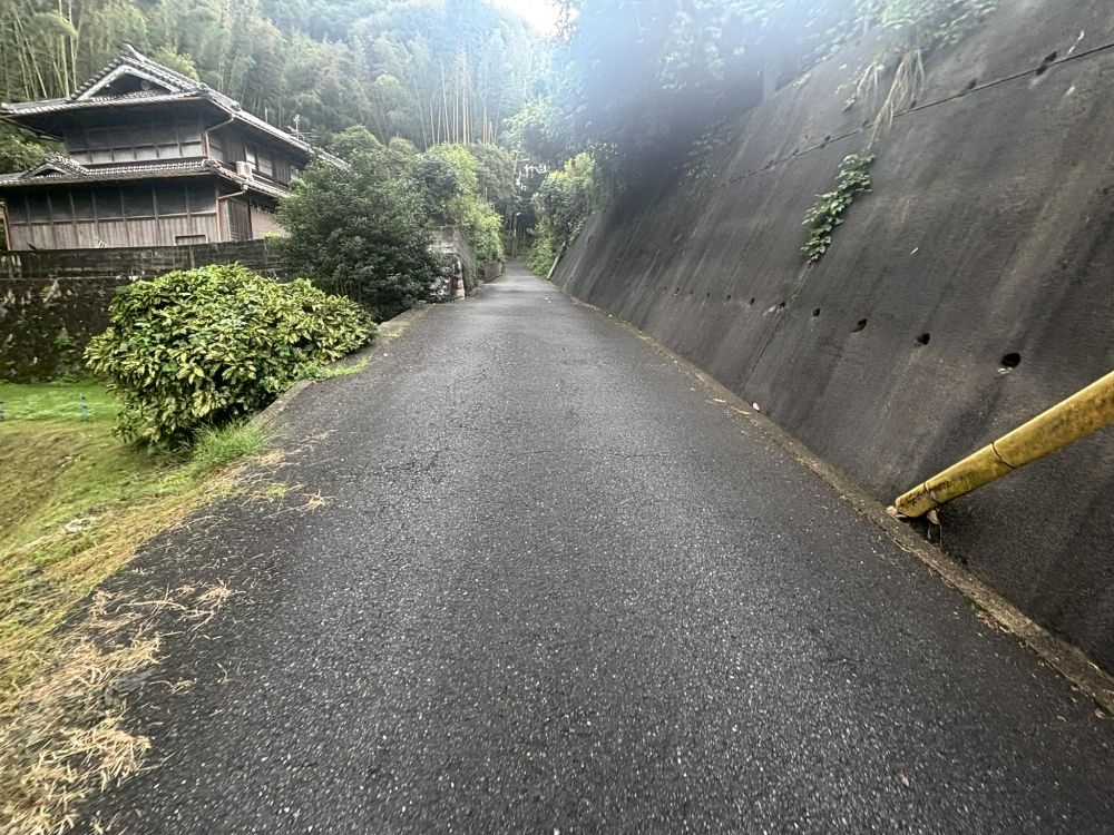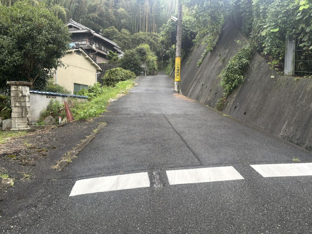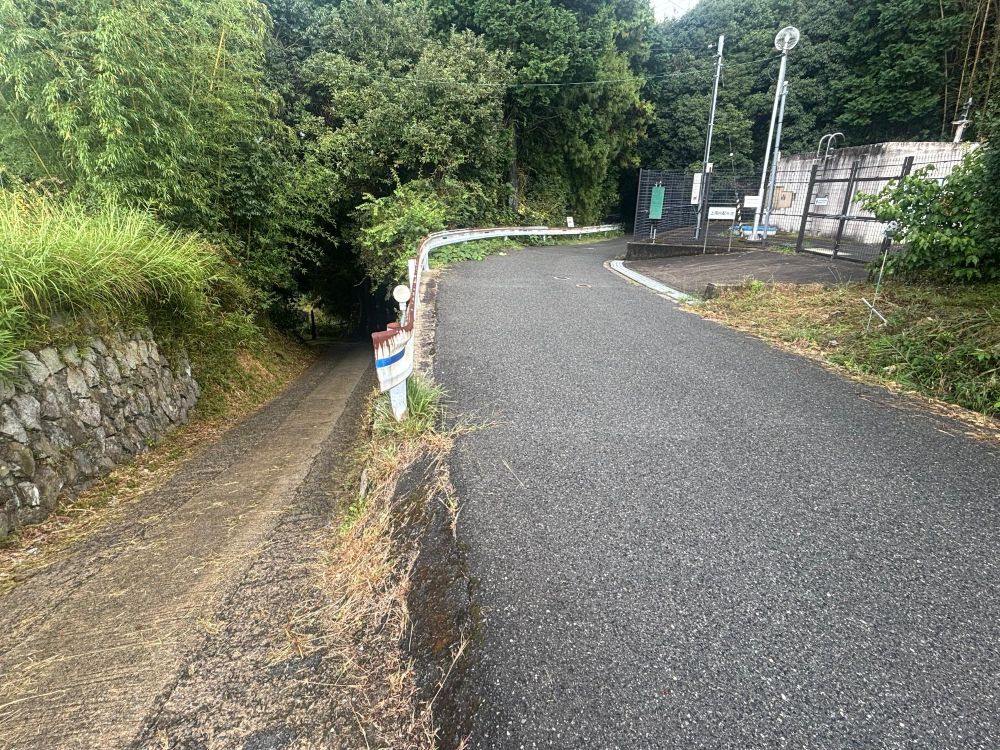 坂を少し登って、振り返ったところです。画像中央の上のあたりに青い看板が見えますが、あそこに府道が迂回していることがわかります。
