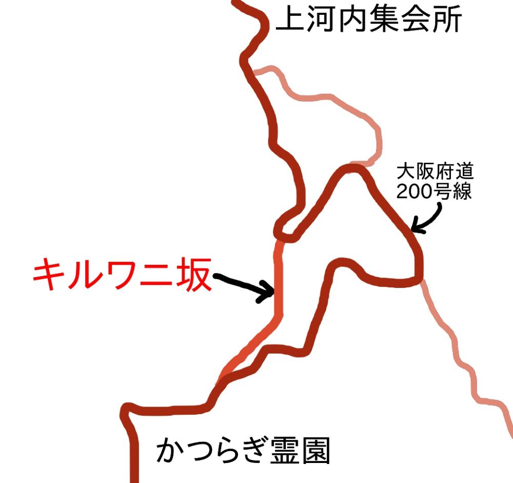 キルワニ坂の場所を確認すると河南町上河内にあり、下河内から続く大阪府道200号線(上河内富田林線)の途中にあります。上河内集会所から峠付近にあるかつらぎ霊園までの途中にある、急な登り坂です。その区間、府道のほうは大きく迂回して勾配を上げているのに対して、キルワニ坂は直線的にショートカットできる道となっています。それ故に「激坂」と呼ばれるほどの勾配の高い坂道になっているのです。