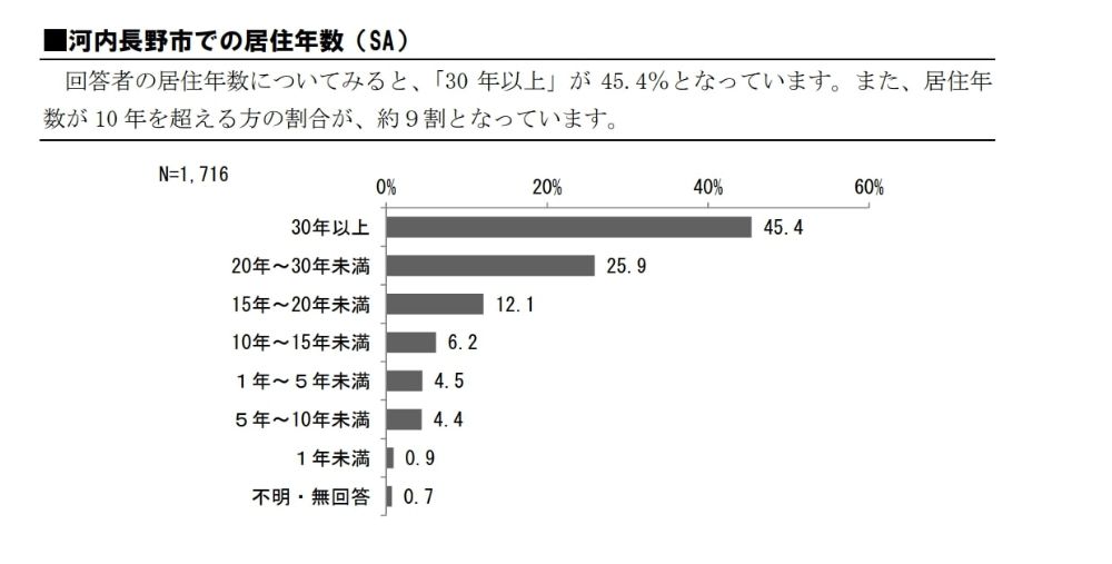 これは回答結果をPDFで公開している中の一部ですが、回答者の居住年数をグラフで見ると、30年以上住んでいる人や20年以上住んでいる人の比率が高く、合わせて71.3%となっています。それに対して居住歴10年未満が9.8%、1年未満の人は0.9%ととても少なくなっています。つまり前回のアンケートでは、「市内に長く住んでいる人が中心となって答えた」という結果になっています。