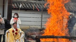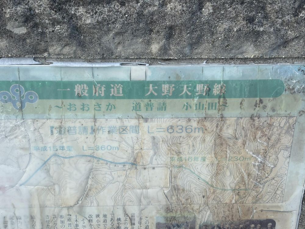 そして、府道の名称の下は「おおさか 道普請 小山田」の文字が見え、その下に2003(平成15)年度、2004(平成16)年度と書いてあり、それぞれの道を青と緑色で示しているのがわかります。さらに道普請作業区間L=636mの表記も見えます。つまり平成時代の中期、21世紀初頭に行われている道普請(道路工事)であることがわかります。