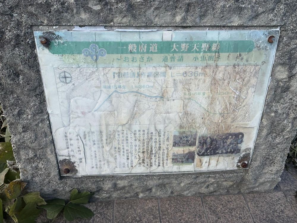 下に説明書きがあります。ざっくり見てみると平成15年度より3年に亘(わた)って、小山田自治会と富田林土木事務所との府民協働で改修された道路とのこと。府民協働とは、共通の目的のために府(行政)と府民が一緒に考えて対等な立場で認識、尊重しながら行動することです。大阪府のページにも府民との共同についての記載(外部リンク)があります。