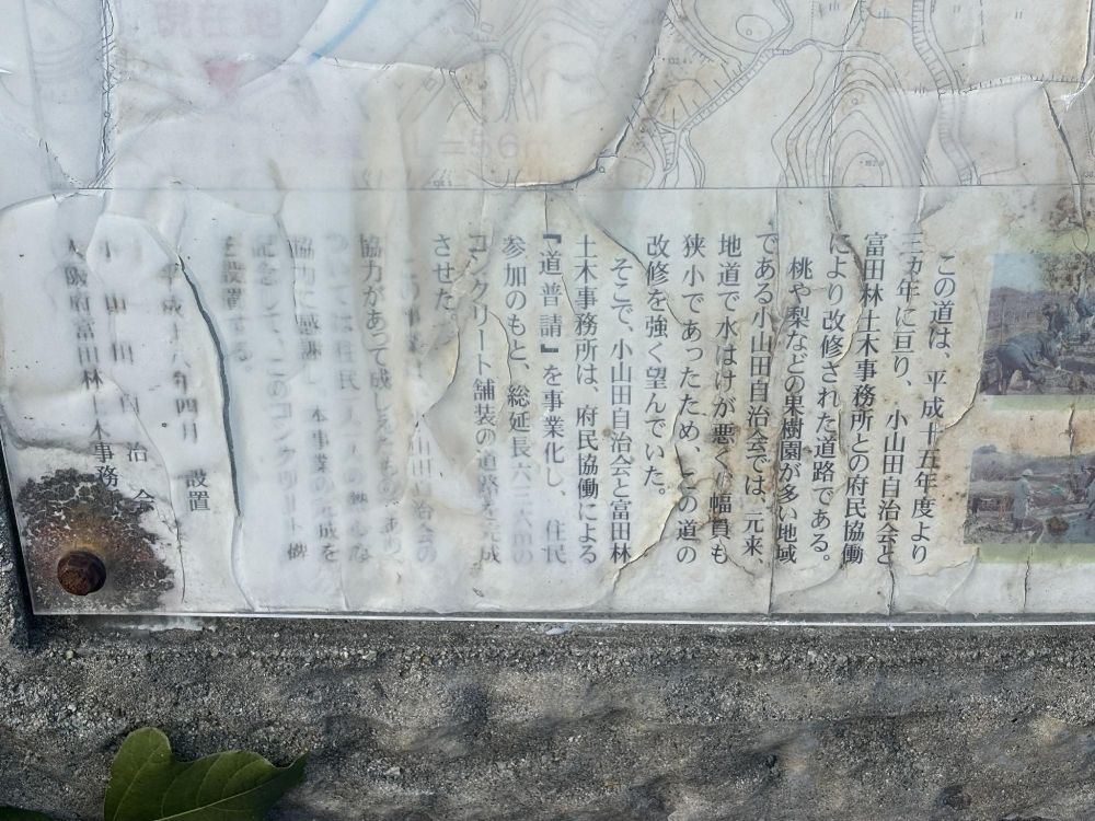 ただ道路を大阪府の富田林土木事務所が行うだけなら、このようなコンクリート碑がつけられることはないはずです。設置された理由は、道普請が小山田自治会の協力があってなしえたものとし、住民一人一人の熱心な協力に感謝し、今回の事業が完成したことを記念して事業開始から3年後の平成18年4月に設置されたそうです。