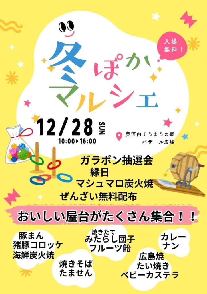 奥河内くろまろの郷の中にあるバザール広場は毎週のようにイベントが行われていますが、今年最後の日曜日、12月28日10:00~16:00までは冬ぽかマルシェが行われます。