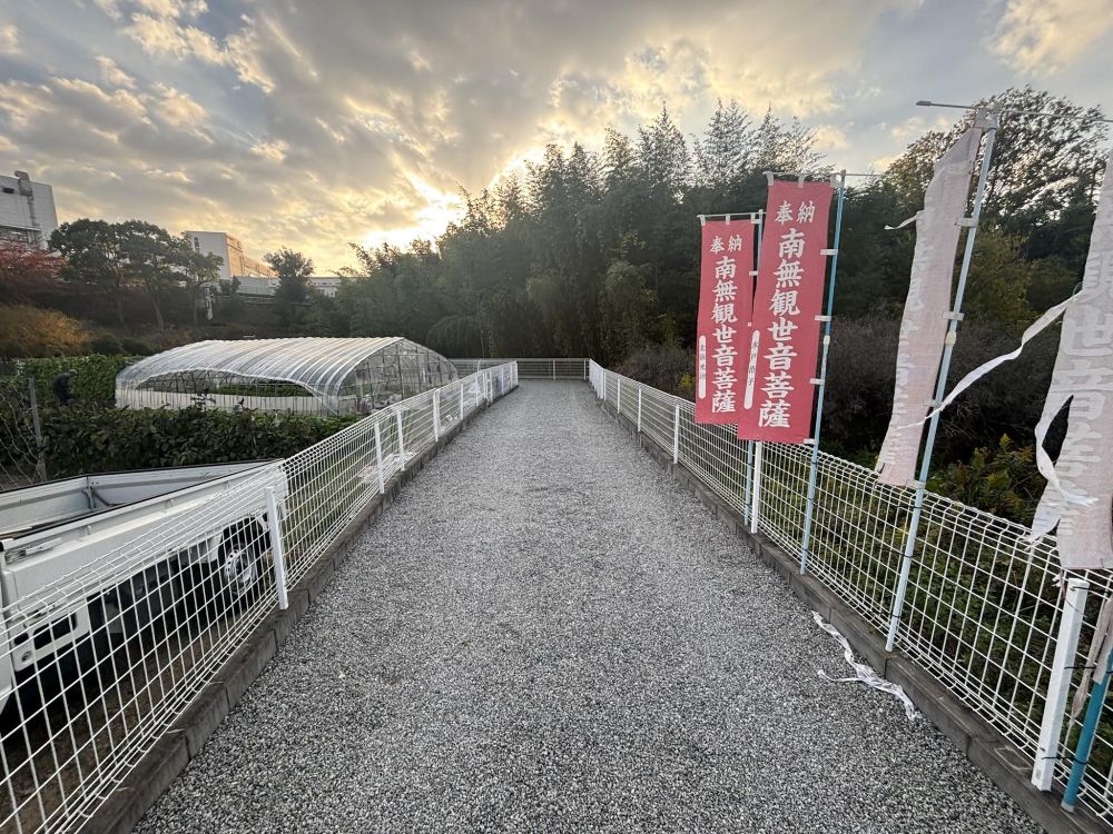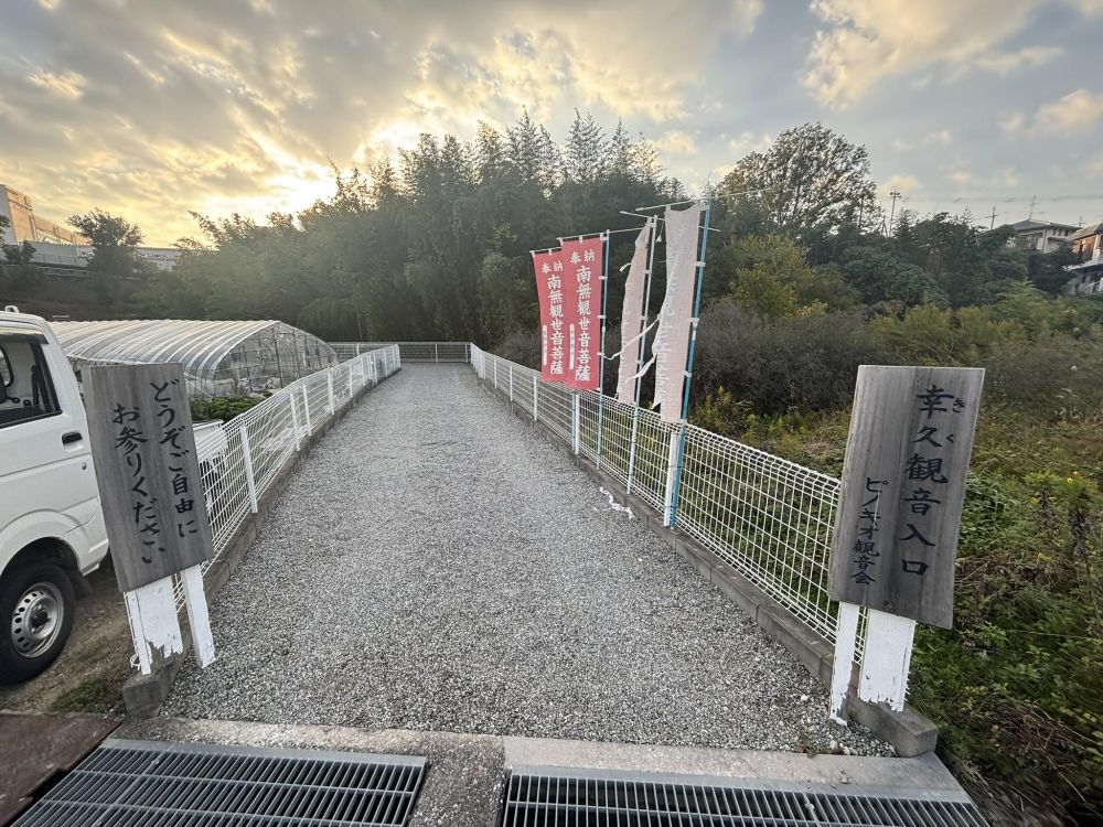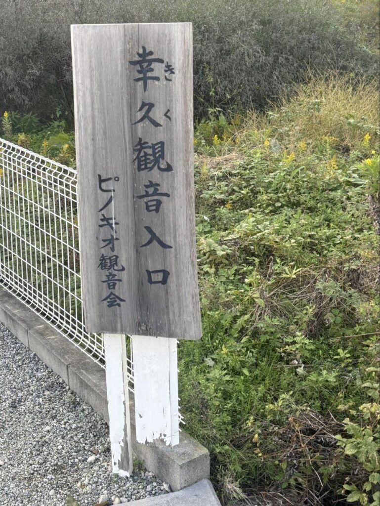 「幸久(きく)観音入口」という名前です。下にはピノキオ観音会と書いてあります。調べてみると、堺市中区深井に本部がある宗教法人で、1982(昭和57)年から十一面観世音菩薩を安置。観音菩薩に手を合わせる方が集う場所とのこと。完全予約制で相談にも応じているそうです。