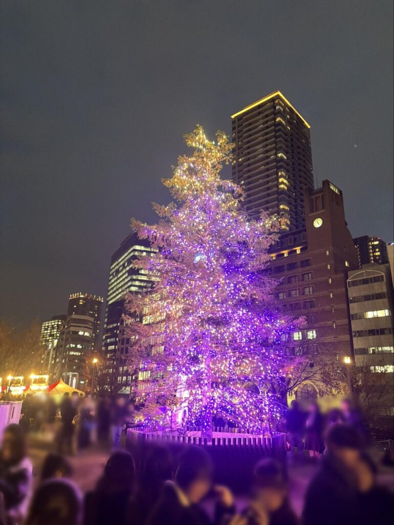 途中には大きなクリスマスツリーの光があります。上のほうだけ黄色で下のほうが紫色をしています。これは「ドリカムツリー イルミネーション」と呼ばれるもの。