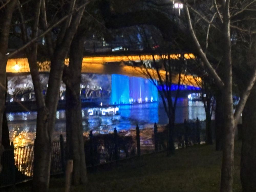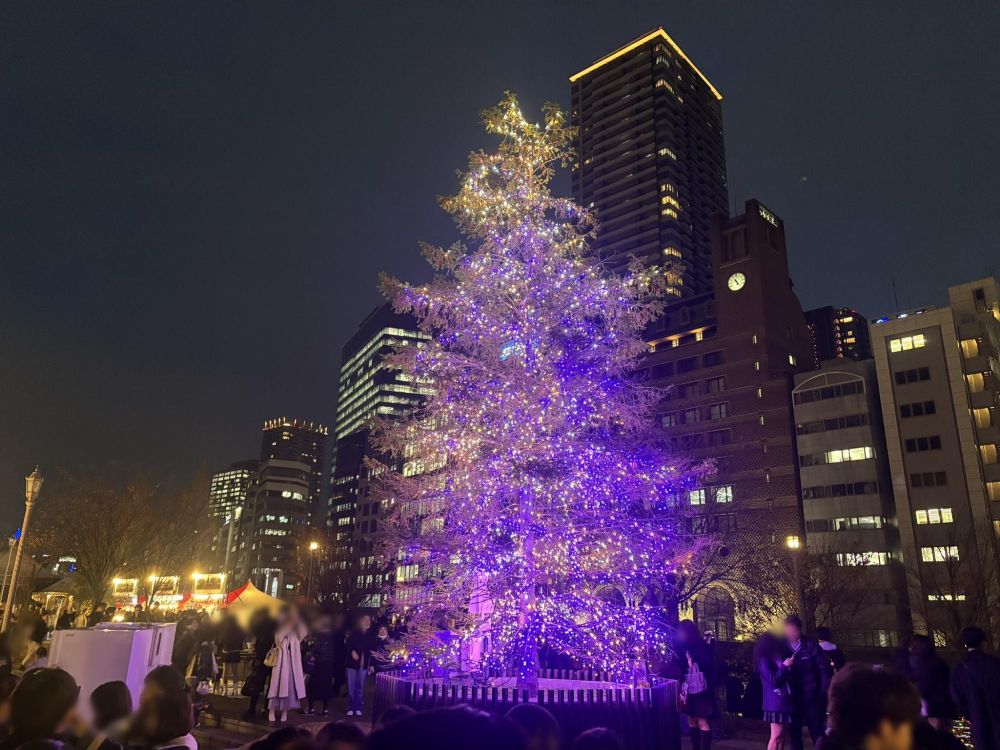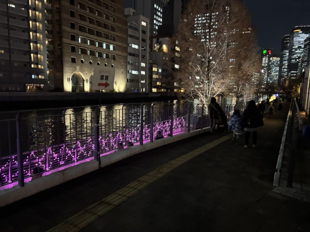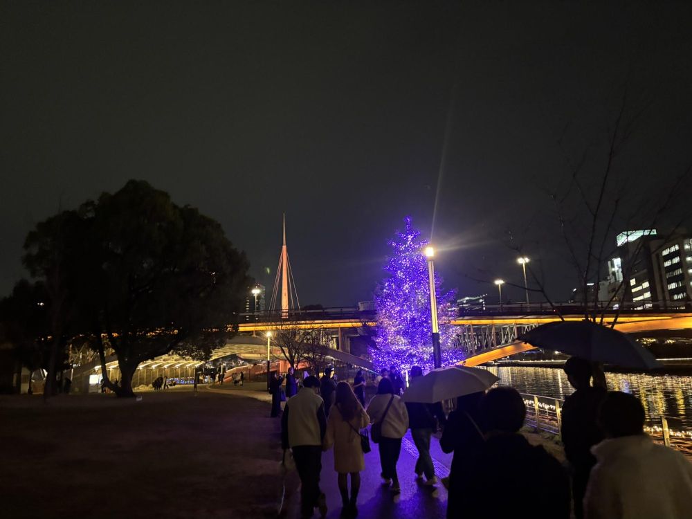 中之島の最も東橋のほうまで歩いていきました。紫色に輝くドリカムクリスマスツリーが見えます