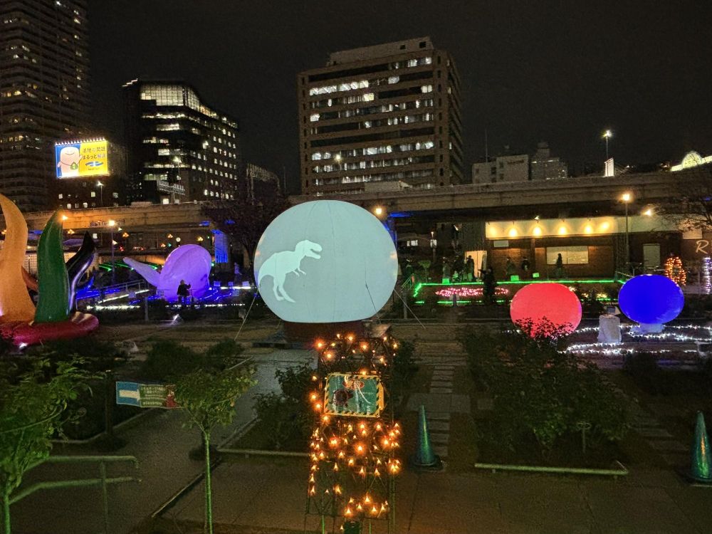 こちらのイルミはちょっと個性的な雰囲気です。これは大阪芸術大学芸術計画学科の作品で、恐竜の世界を光と音で再現(外部リンク)したものです。「DINO☆FANTASIA〜中之島・記憶の発掘〜」というタイトルがついています。