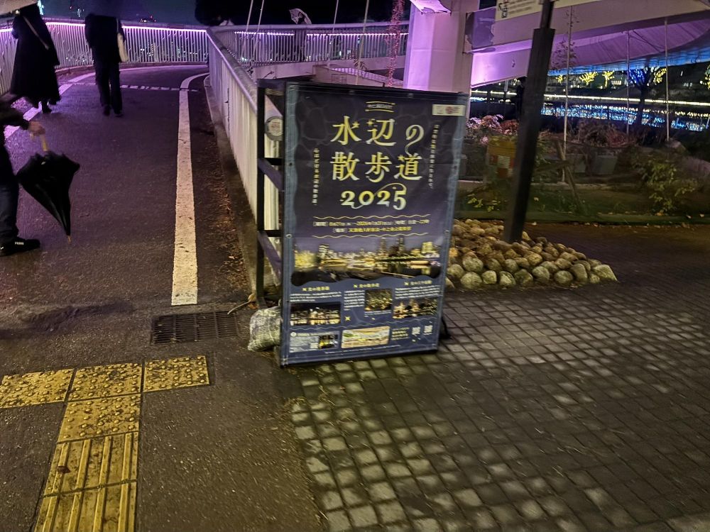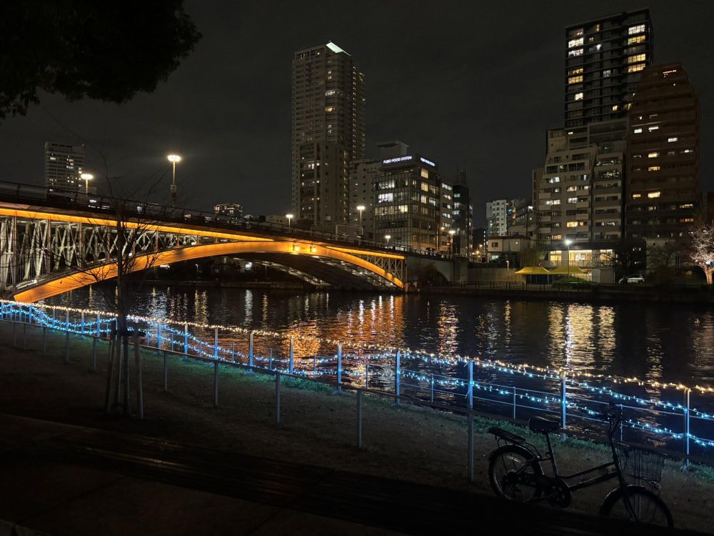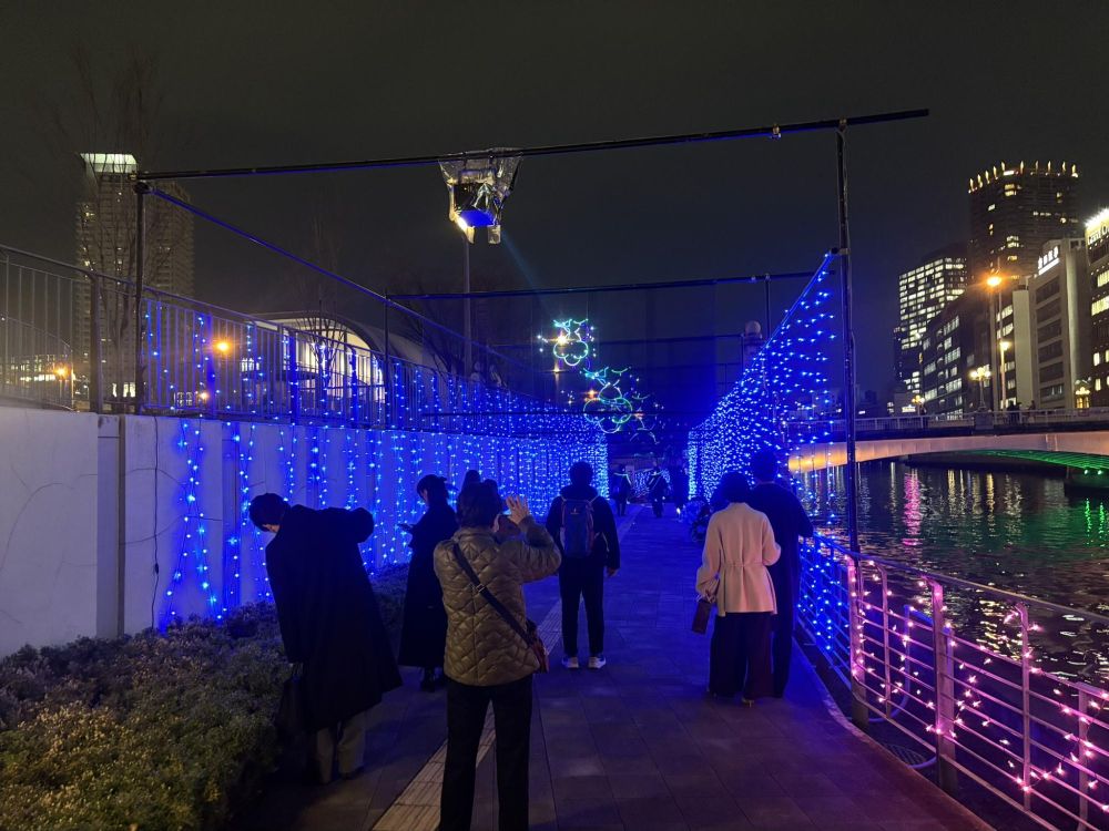リバーサイドイルミネーションという名前がついています。「都会のイルミ」というタイトルをつけたくなるような一枚です。青い光のほうに向けて歩いていきましょう。