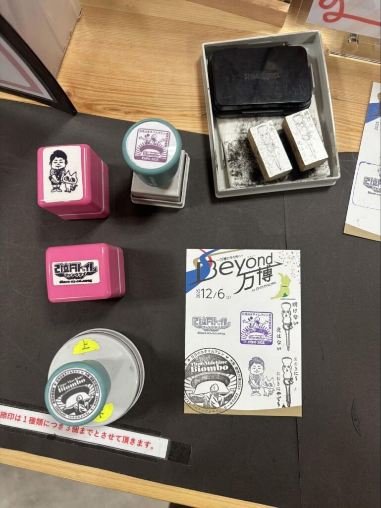 こちらです。もともと用意されていた万博関係3つのスタンプの他、2億円トイレスタンプや菊水産業さんのつまようじキャラ「つま子さん」(外部リンク)のスタンプも増えて豪華に6種類のスタンプが押せるようになっていました。