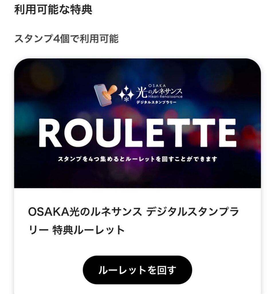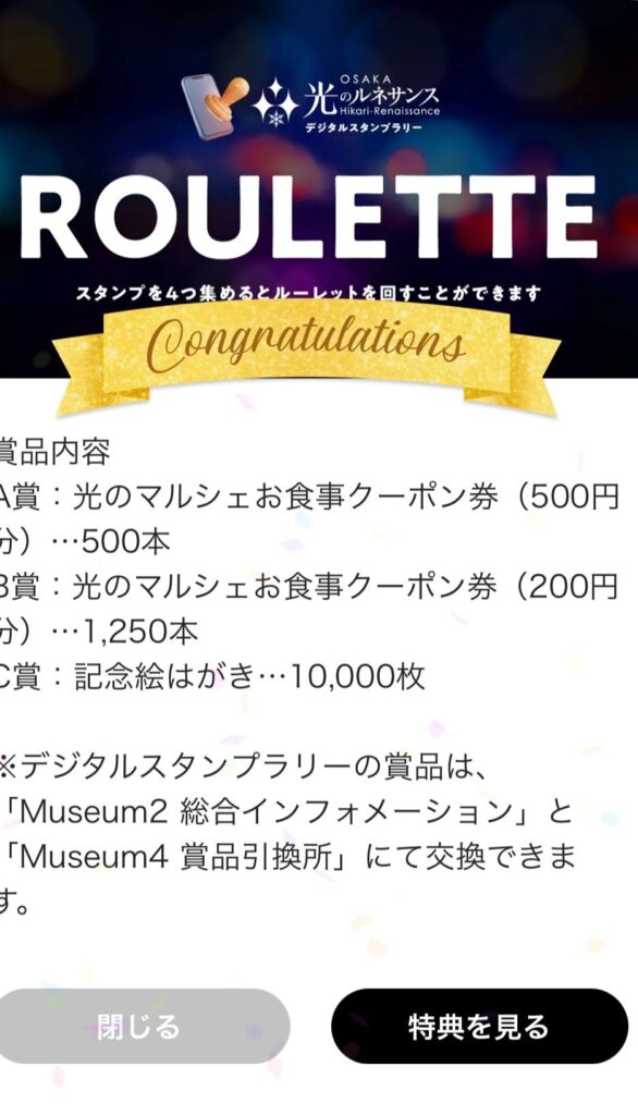 スタンプを全部集めえると、光のマルシェのあるところ中央公会堂の前に総合案内所があるのでそこの人に見せて、ルーレットを回します。