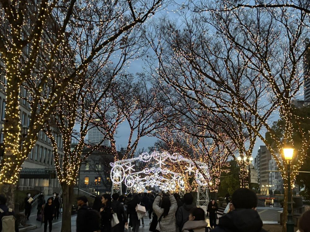 この時間帯から一方通行ということで、メイン会場に向かって歩いていきましょう。市役所横から中央公会堂前までの中之島イルミネーションストリートと名付けられたイルミは、嬉しいことに12月31日25時(午前1時)まで行われます。