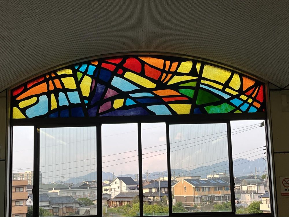 千代田駅に上がってきました。このように、中から見るとステンドグラスが美しく見えます。これはステンドグラスが外部からの透過光で見るために作られているからで、キリスト教の教会のステンドグラスも中から見ると美しく見えます。