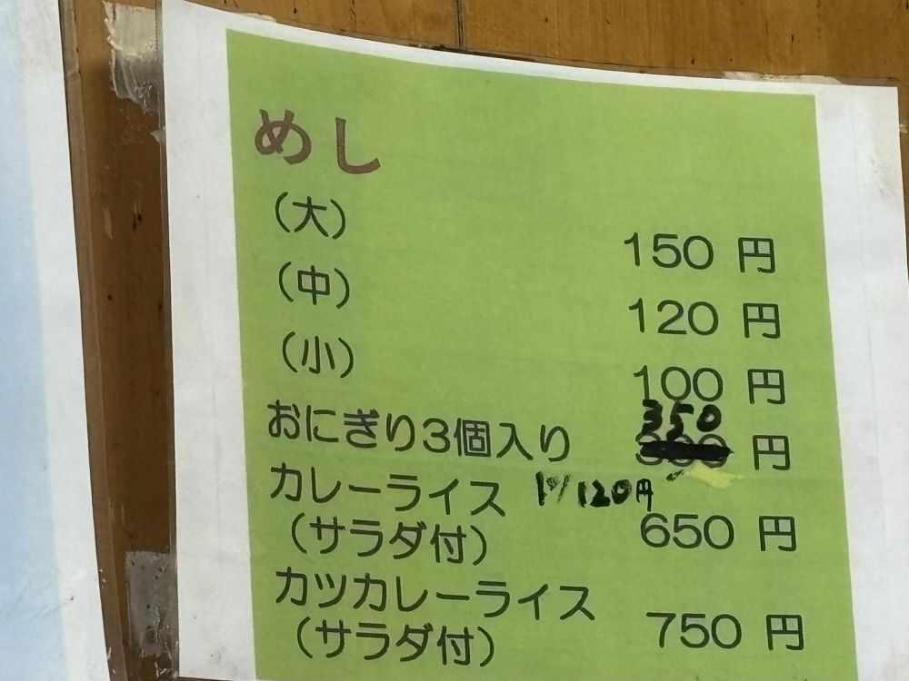 定食屋さんといえば「ごはん」ということで、大、中、小が選べます。そのほかおにぎりとカレーがあります。カツカレーが通常のカレーより100円だけ高いのはお得ですね。
