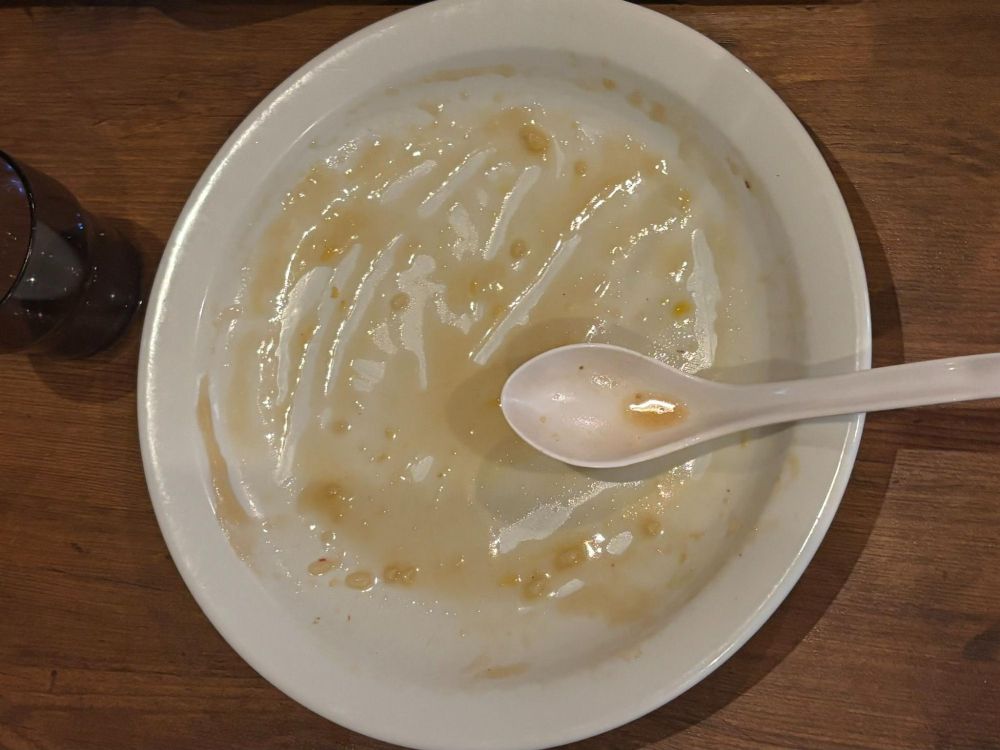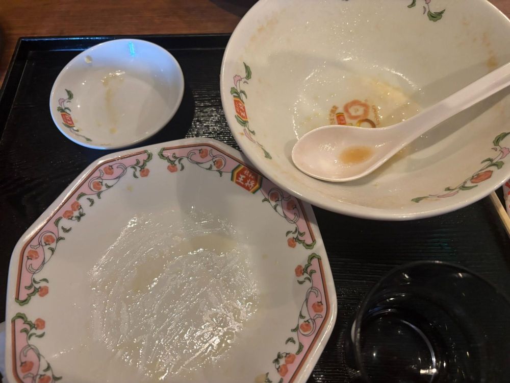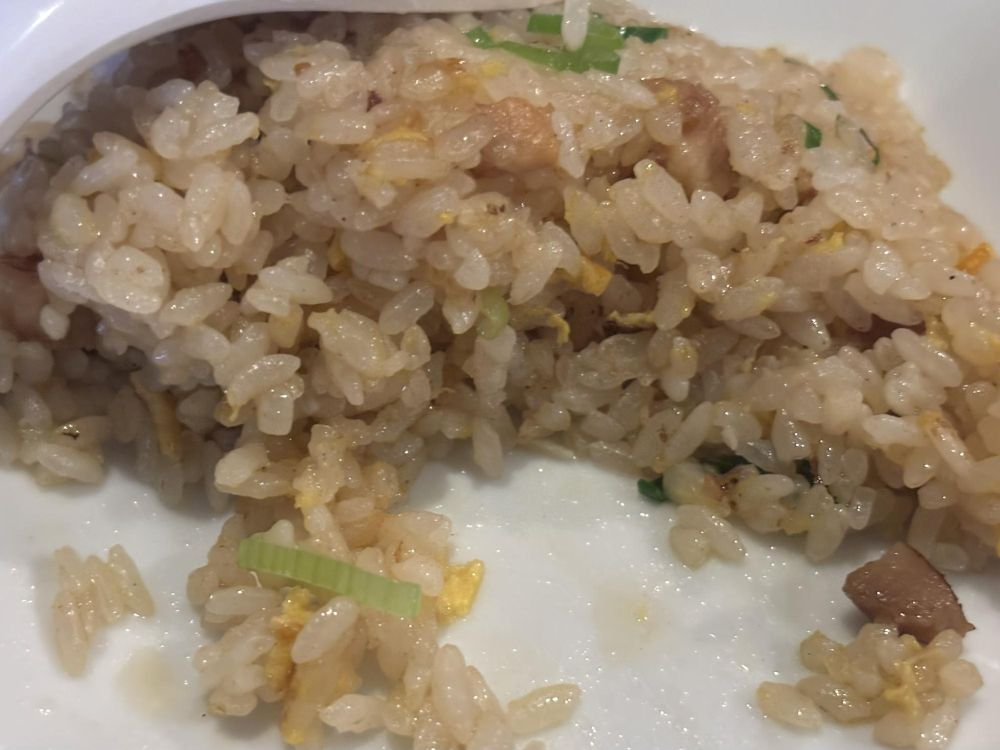 次は炒飯です。炒飯は食べる前から「こういう味だ」とわかっているのに、口に含むと旨味が一気に口の中に広がり、気が付いたらふた口めが早くも口の目の前にまで蓮華が動き、ほとんど間を置かずにそのま口の中に入れてしまうくらいの速度で食べてしまうほどの安定の旨さ。これがチェーン店の炒飯の強みと言えます。