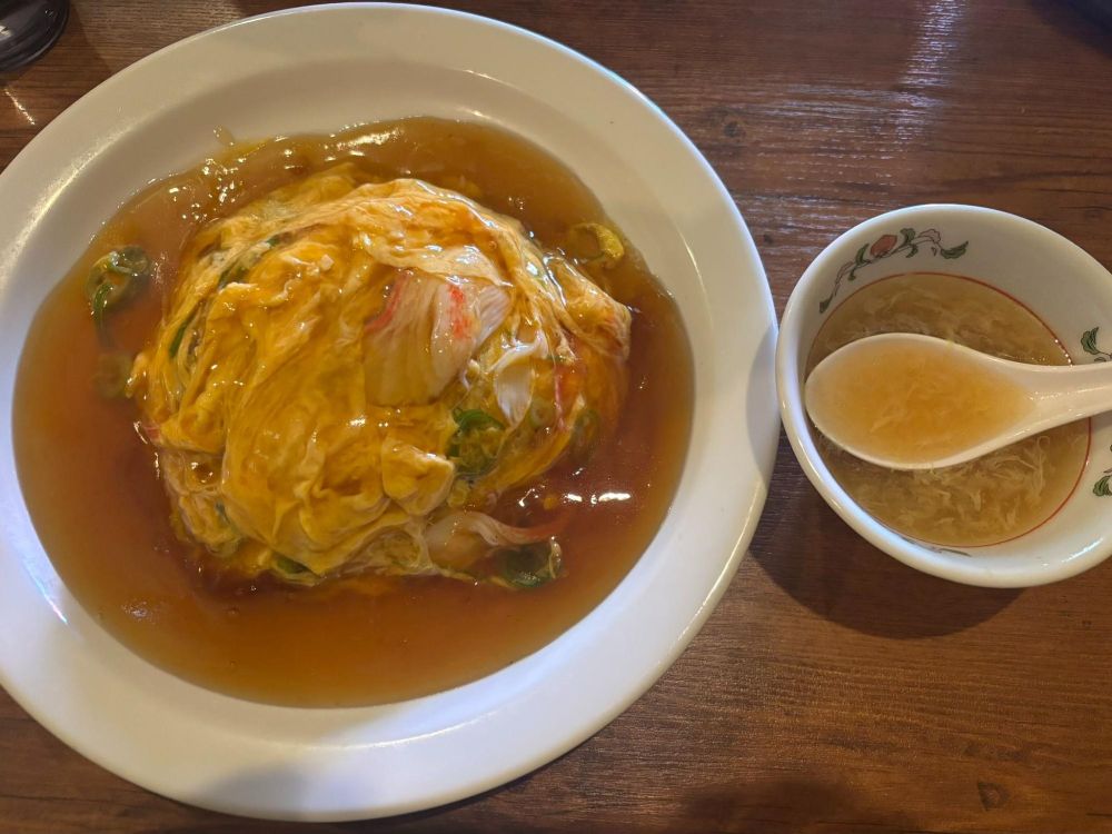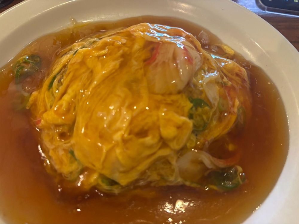 そしてもうひとつが天津炒飯(814円)です。公式ページによると裏メニューとして提供されていたそうで、炒飯と天津飯を融合させたものです。