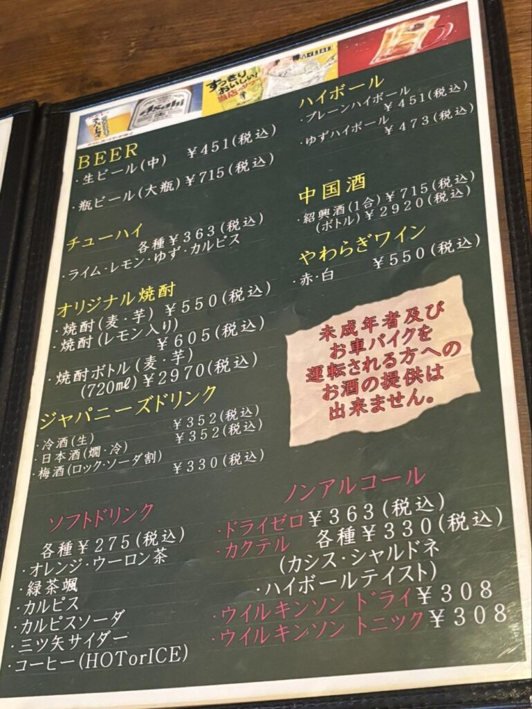 こちらはドリンクメニューです。登山帰りにビールや焼酎を飲んで帰ろうという人にも人気がありそうです。駅前にあって電車・バス利用者が見込める場所だと有利ですね。
