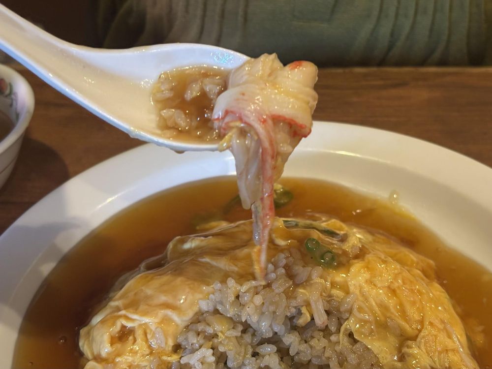 裏メニューからスタートしているだけあって、絶妙の旨さ。トロトロあんかけが炒飯のご飯にまとわりついて、炒飯の旨味とあんかけの甘味が交錯しながらも違和感なく、さらにそこに卵の味も加わることで見事に調和がとれているという納得の完成度です。炒飯があんかけのコラーゲンとこんなに相性が良いとは本当に驚きました。そしてカニの身もしっかり入っているので、価格以上のお得感がありますね。