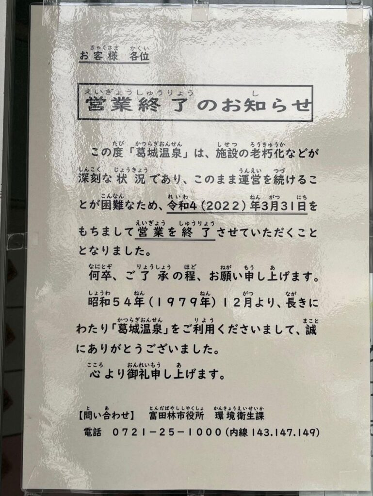 といった市の判断において、葛城温泉は残念ながら建て替えることなく、営業終了が決まってしまいました。仕方のないことですね。