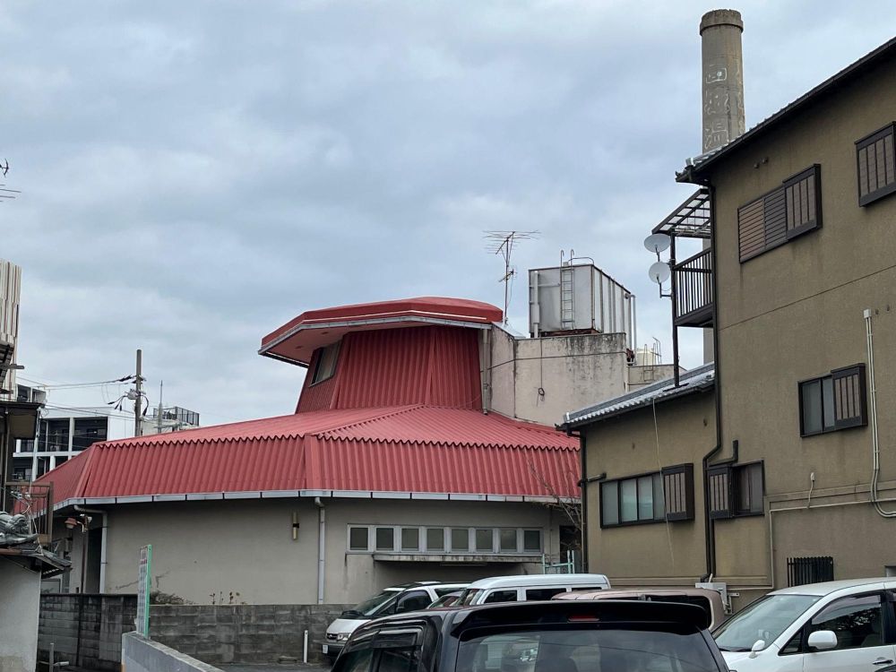 改めて葛城温泉の外観を見ると、銭湯の中でも比較的モダンな気がします。八角形の赤い(レンガ色)の屋根を持ち、母屋も七角形と複雑な構造になっています。