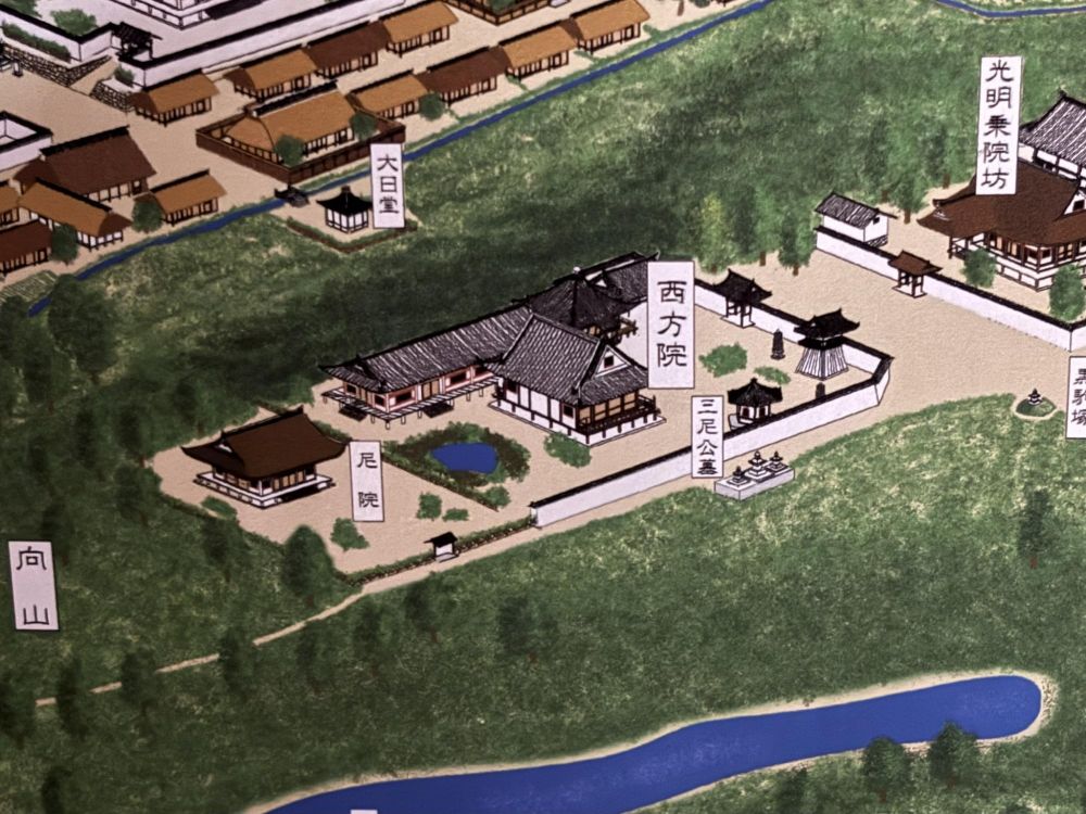 (寺内にあった中世伽藍推測図「法楽尼寺」という名前で西方院が描かれている)