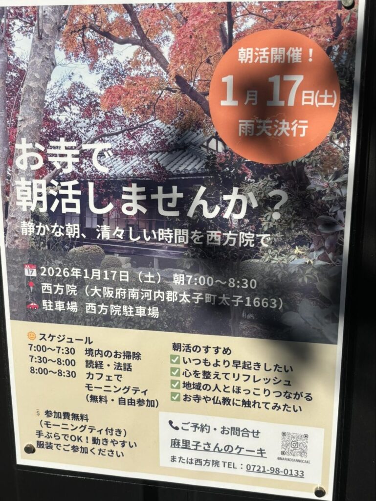 早起きして仕事などを始める前に自分の好きなことを行う「朝活」は、朝の時間を意識的に活用することで、特に若い社会人の注目を集めています。それと同じことを西方院でも今年から始めました。これは併設しているカフェを運用している「麻里子さんのケーキ」さんが提案し主体的に行っています。