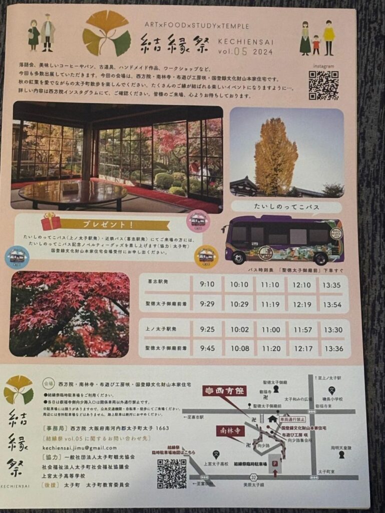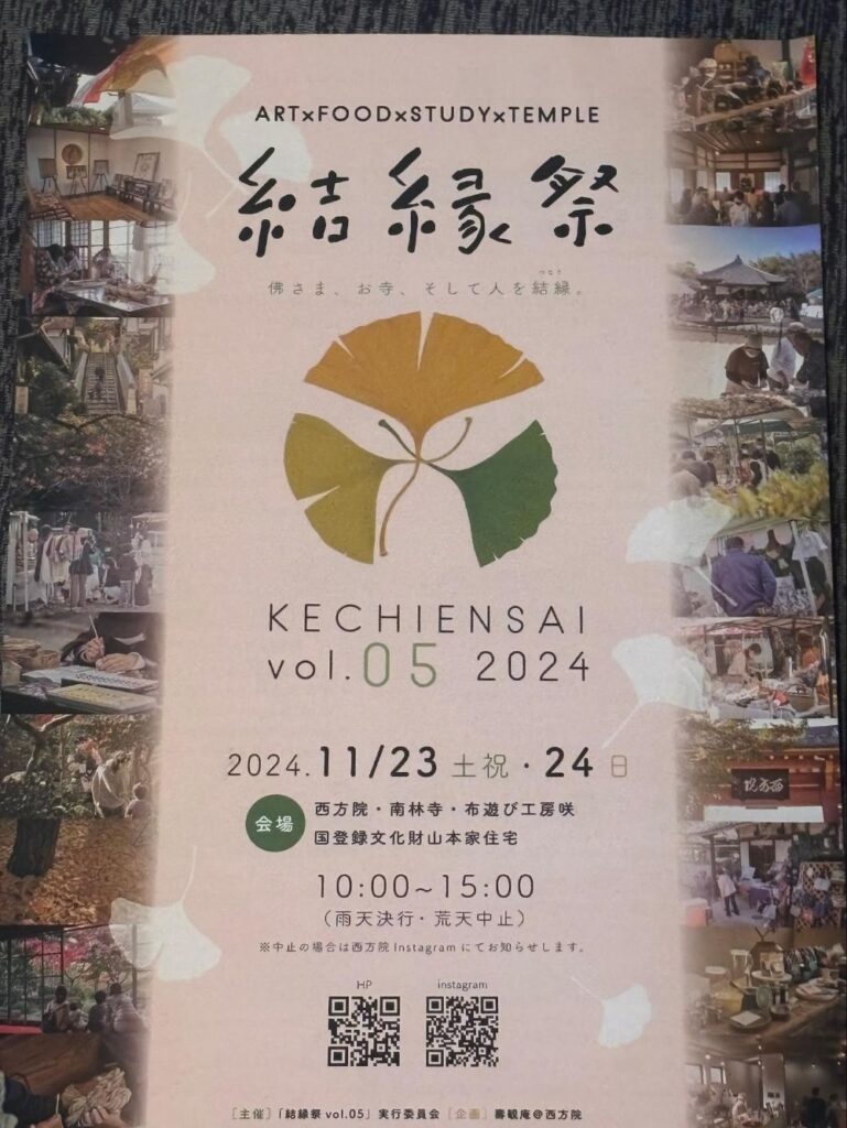 結縁祭のテーマは「佛さま・お寺・そして人を結縁(つなぐ)。」です。前回は2024年だったので今年は行われませんでしたが、来年も行う方向で準備を進めており、西方院instagramによれば、太子芸術祭と同時開催として2026年11月14、15日の開催が決まりました。