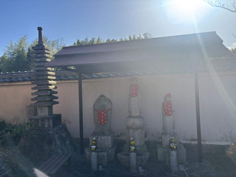 (西方院の南側にある三尼公御廟所は凝灰岩製層塔が3基並んでいる)