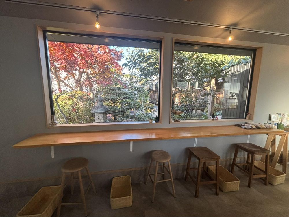カフェスペースを撮影させていただきました。カウンターになっていて大きな窓がふたつあり、内庭の景色が見られます。