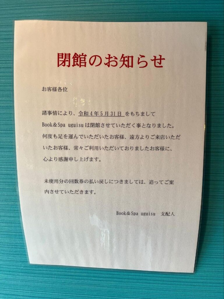 まさかの悲報です。富田林唯一のスーパー銭湯「ブック&スパうぐいす(Book&Spa uguisu)(以下、うぐいすの湯さん)」が、今月末で閉店します。