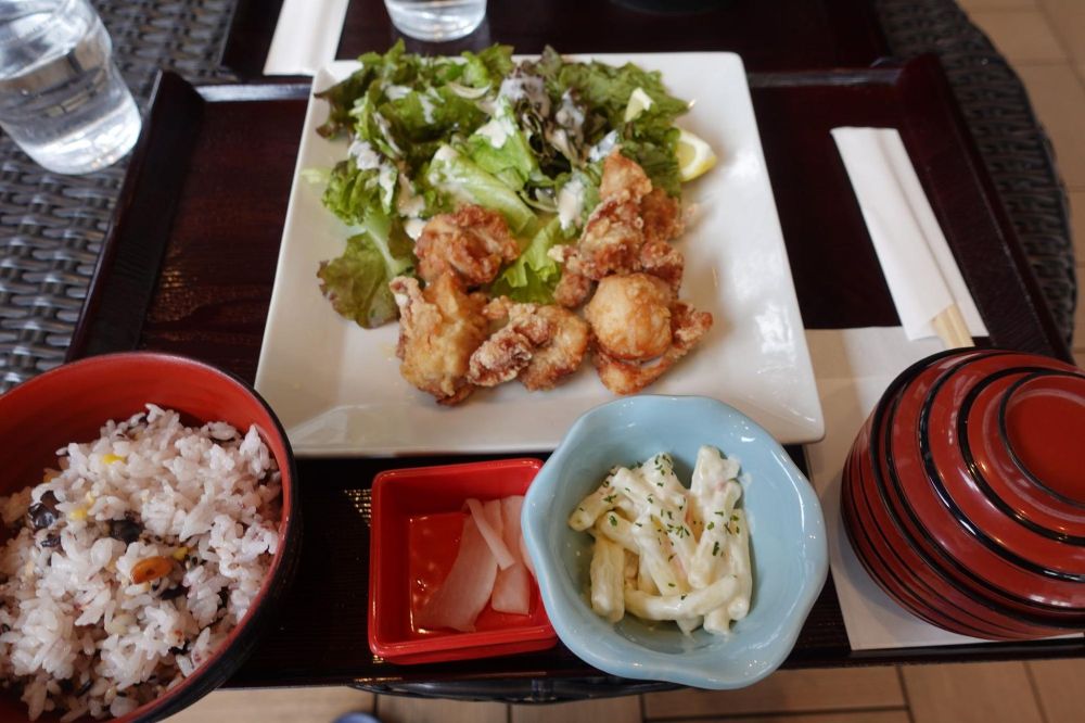 こちらが人気メニューのから揚げ定食。ご飯は雑穀米と白米から選べます。