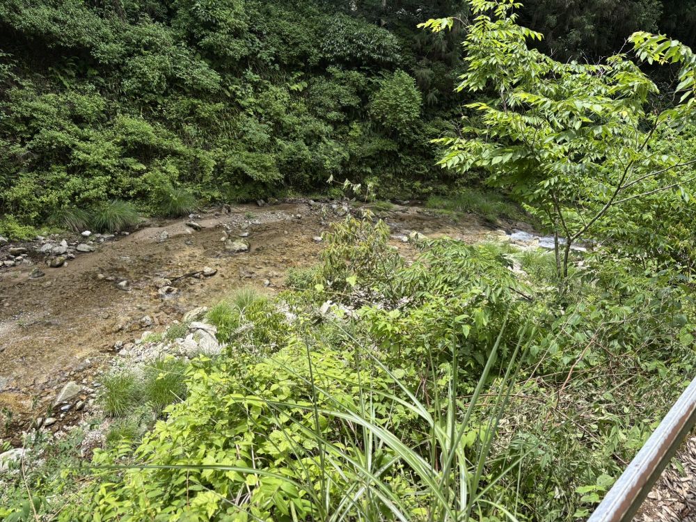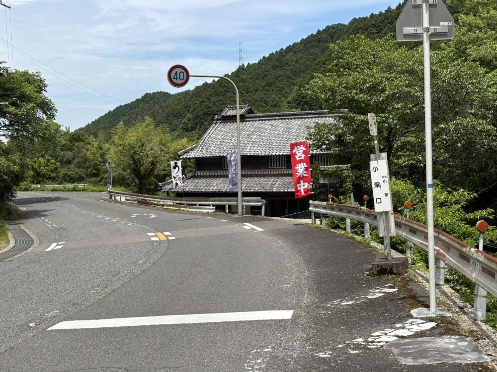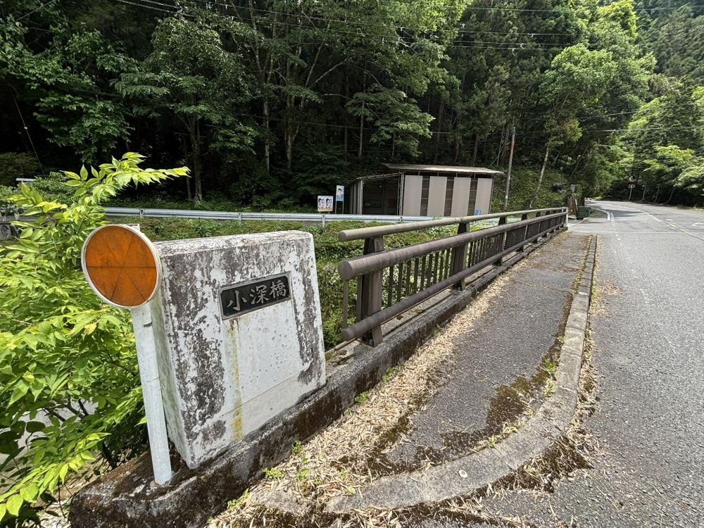 橋を渡って振り返りました。橋の名前は小深橋です。画像の中ほどから上にあるガードレールは先ほど見た小深の集落に向かっている道です。