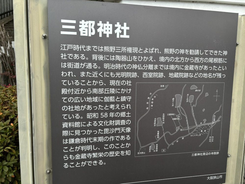 三都神社の説明です。江戸時代まで熊野三所権現と呼ばれていて、熊野にある神々を勧請(かんじょう:御霊を呼ぶ)してできた神社です。そして背後の陶器山の尾根には天野街道があります。そして境内にかつて金蔵寺という大きな寺院があったそうです。