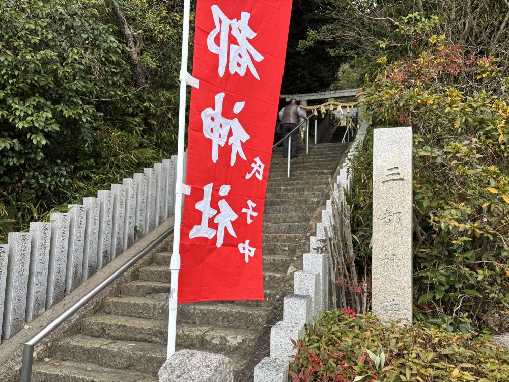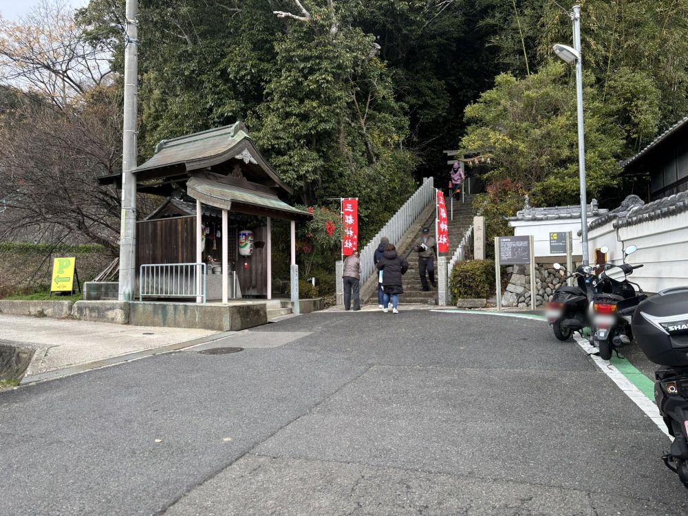 神社は階段の上にあります。三都神社は大阪狭山市今熊にありますが、神社に熊野の神々を祀ったことから今熊野と呼ばれるようになり、それから「今熊」という地名誕生につながったそうです。