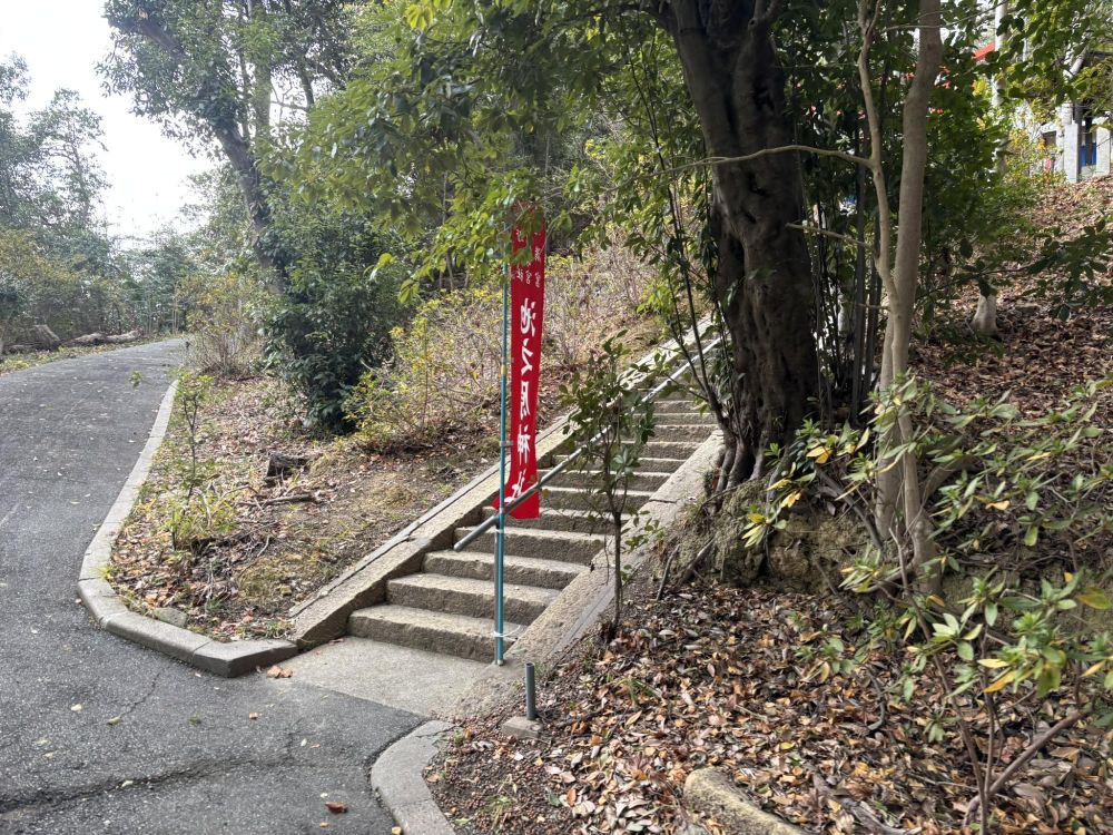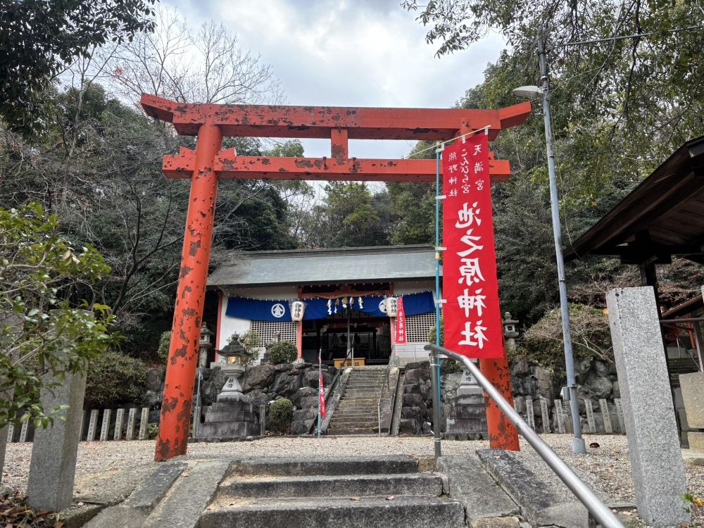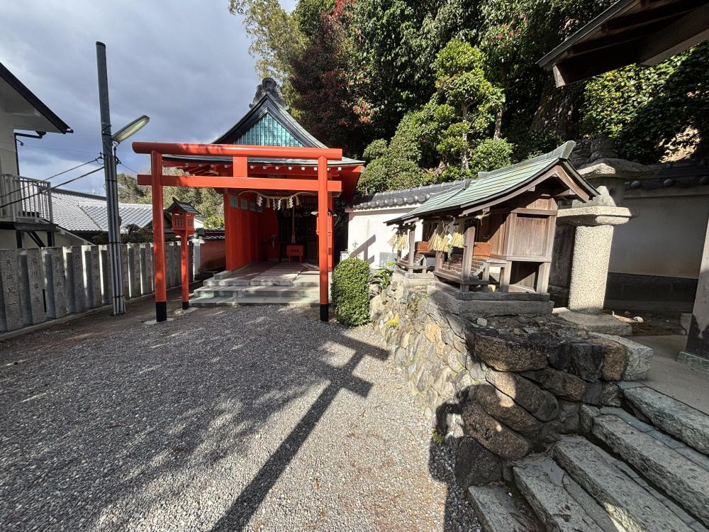 階段を上がったところに赤い鳥居があり、神社境内になります。
