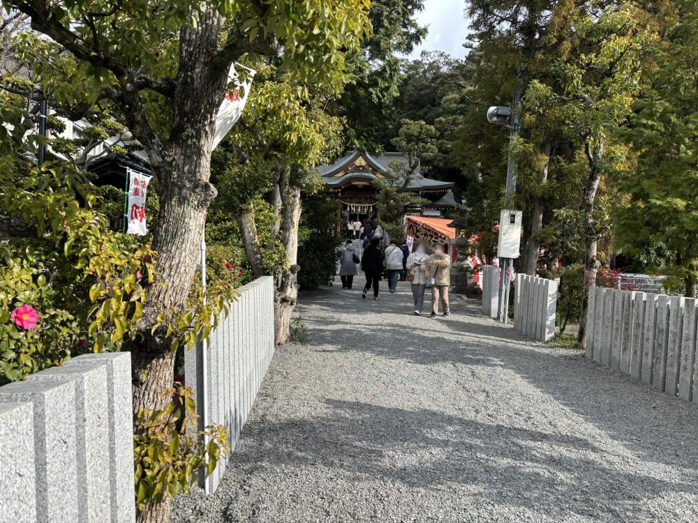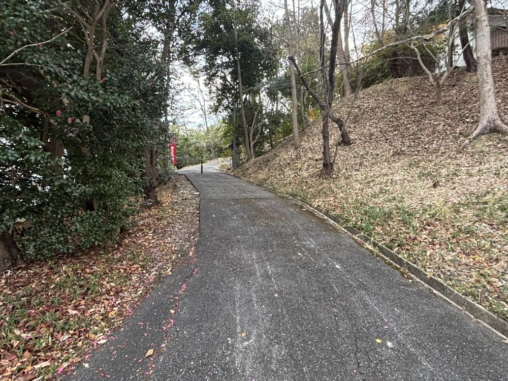 地車小屋からスロープ状になっている道を歩きます。秋祭りの宮入りのころには多くの人でごった返しそうですが、正月2日目にもかかわらず、狭山神社や三都神社と比べて静かです。