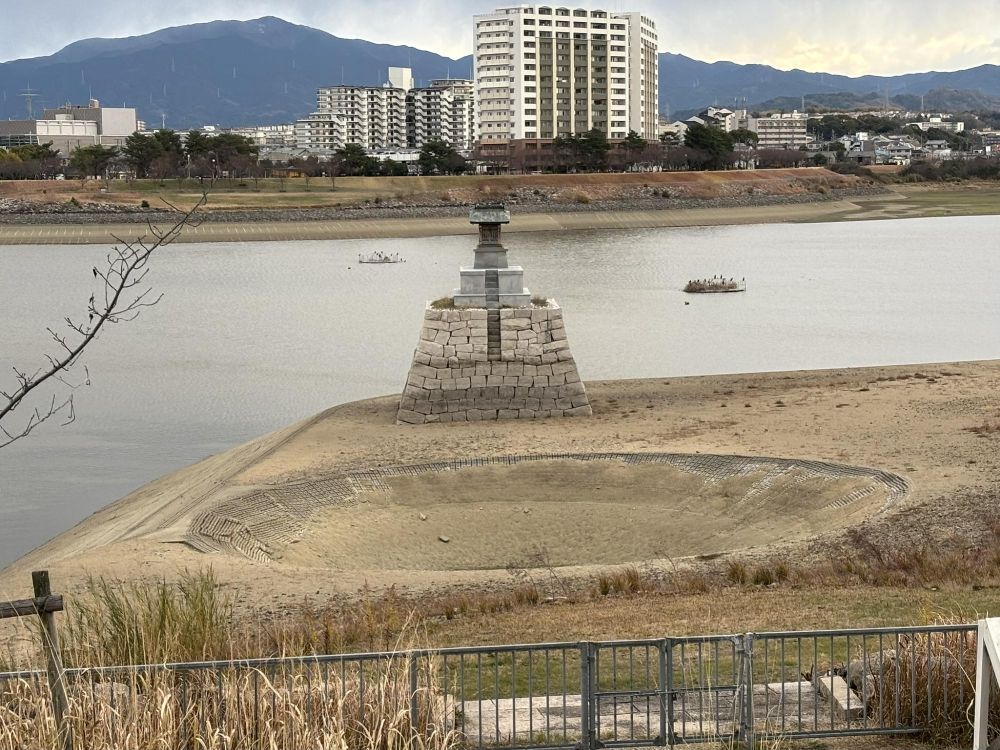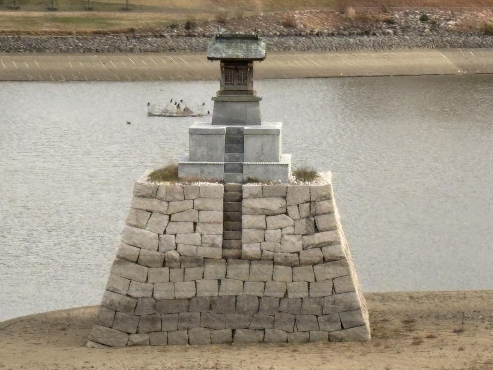 狭山池の前に来ました。すでに狭山池を守護している龍神を祀る龍神社の社が見えますが、